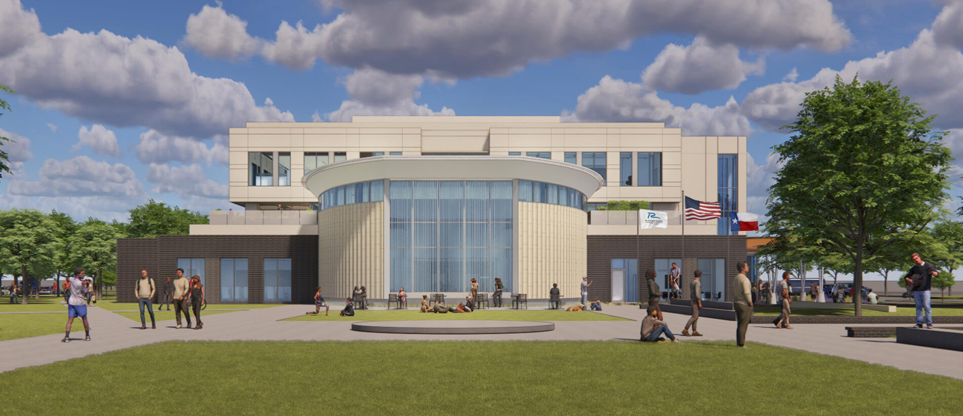 The newly constructed City Hall and Municipal Campus will boast a variety of office spaces, conference rooms, break rooms, council chambers, and a fully covered paver patio. The building will feature painted TPO roofing for protection, metal wall accents on the exterior, copper cladding, and radiused window walls to enhance its aesthetic appeal. Given its high-profile location in the heart of Richardson, numerous custom treatments have been incorporated to ensure the space remains unique. Additionally, tree protection during construction was a top priority for the client, requiring meticulous attention to logistics details.